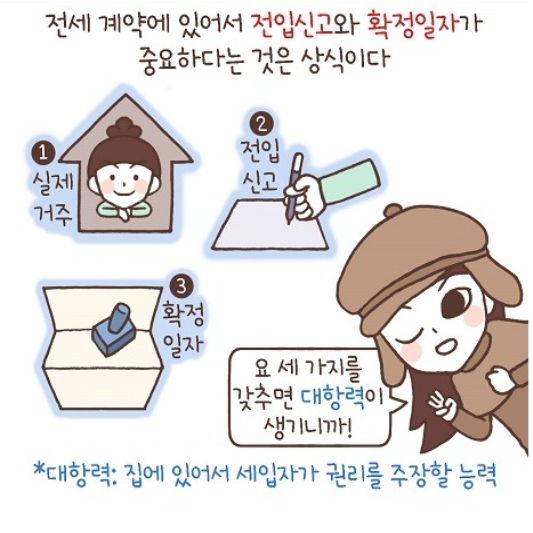 즉, 대항력은 그 집에 실제로 거주하고(주택의 인도), 전입신고(주민등록)를 해야생기는 권리에요.