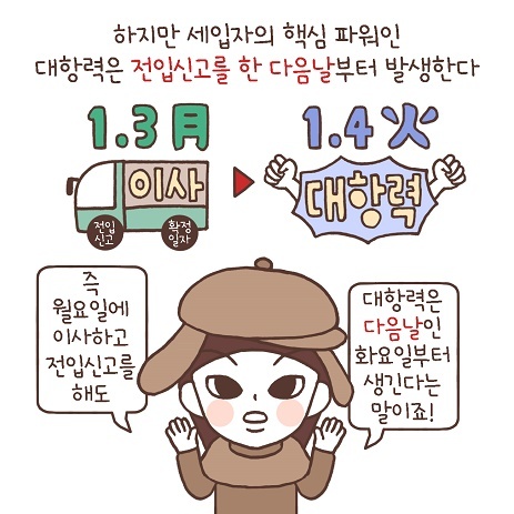다만, 대항력은 전입신고를 한 다음 날 0시부터 효력을 가져요.
