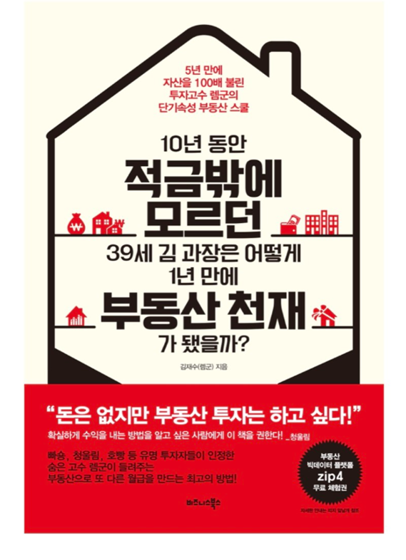 마흔이 되기 전에 돈과 시간에 자유로운 인생을 만들고 싶다는 꿈을 꾸는 사람들을 위해 생계형 외벌이 노동자였던 저자가 부동산 투자를 통해 자산을 100배로 불리고 경제적 자유를 누리게 된 과정과 그 투자전략을 들려주는 『10년 동안 적금밖에 모르던 39세 김 과장은 어떻게 1년 만에 부동산 천재가 됐을까?』.